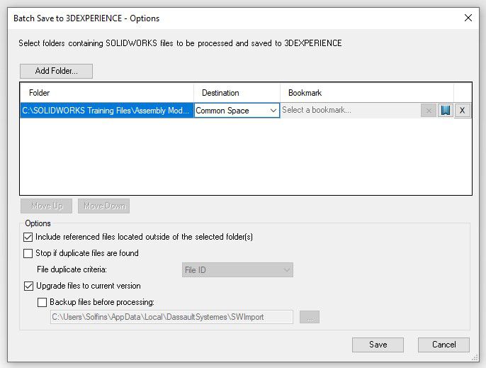 Ovaj način čuvanja je pogodan kada je potrebno veliku količina SolidWorks fajlova, koji su raspodeljeni u više foldera, sačuvati na platformu. Takođe ovaj način čuvanja eliminiše duplikate, ako postoje i upozorava korisnika na to (ako su određene opcije uključene).