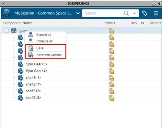 Prvi način čuvanja fajlova na platformu je preko komande Save iz MySession prozora. SolidWorks fajlovi se otvaraju sa lokala ili mreže i nakon njihovog uređivanja se preko komande Save ili Save with Options, u MySession prozoru, čuvaju na platformu.