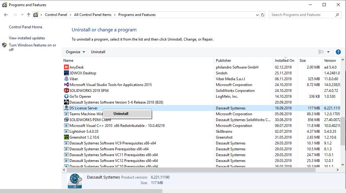 Kako bi započeli proces uninstall-acije Catia-e V5, potrebno je u Control Panelu pokrenuti Uninstall Program Windows aplikaciju. Zatim je potrebno pronaći DS License Server ikonicu i kliknuti desnim klikom na nju. Na novootvorenom pop-up prozoru potrebno je kliknuti Uninstall kao što je prikazano na slici iznad.