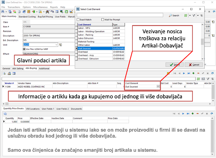 AKA buying radi isti posao na strani nabavke – omogućava da se za naš interni artikal vežu dobavljačev part number, merenje, cenovni uslovi, količinski popusti (price breaks), valute i VMI lokacije, po svakom dobavljaču posebno. U okviru AKA buying taba podešava se za koje dobavljače, od kog datuma i od koje količine važi određena cena ili rabat, što Purchasing modulu i Auto MRP logici daje mogućnost da prilikom generisanja PO predloga izabere ne samo pravog dobavljača, nego i tačan cenovni nivo prema količini. Za firme koje imaju veliki broj cena po kupcima i dobavljačima, AKA sloj postaje centralno mesto za upravljanje tim odnosima, dok Item master čuva „osnovne“ interne informacije.