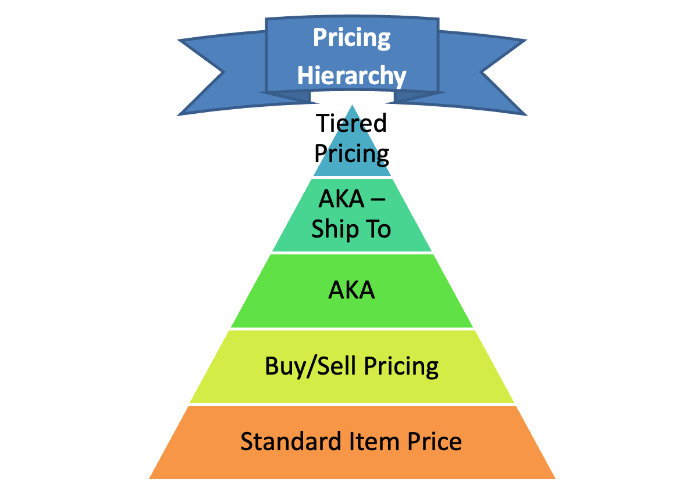 U DelmiaWorks-u se cene artikala ne čuvaju samo na jednom mestu, već postoji čitava „piramida prioriteta“ koju sistem koristi da odluči koja cena važi u datom procesu – npr. na Sales Order-u, Purchase Order-u ili u MRP kalkulacijama. Osnovu čini standardna cena artikla u Item masteru (Standard Item Pricing), ali iznad toga postoje slojevi poput AKA selling cena po kupcu, cenovnih lista, rabata po grupi artikala, kao i specifičnih cena po ugovoru ili projektu, dok se na strani nabavke koriste AKA buying, ugovorene cene po dobavljaču, price break-ovi po količini i valuti. Piramida funkcioniše tako da sistem prvo gleda najkonkretniju cenu (npr. AKA selling za konkretnog kupca i artikal), pa ako je nema ide na sledeći nivo (cenovna lista, default selling price), a tek na dnu je generička cena iz Item mastera – slično i na strani nabavke sa AKA buying i generičkim kupovnim cenama.