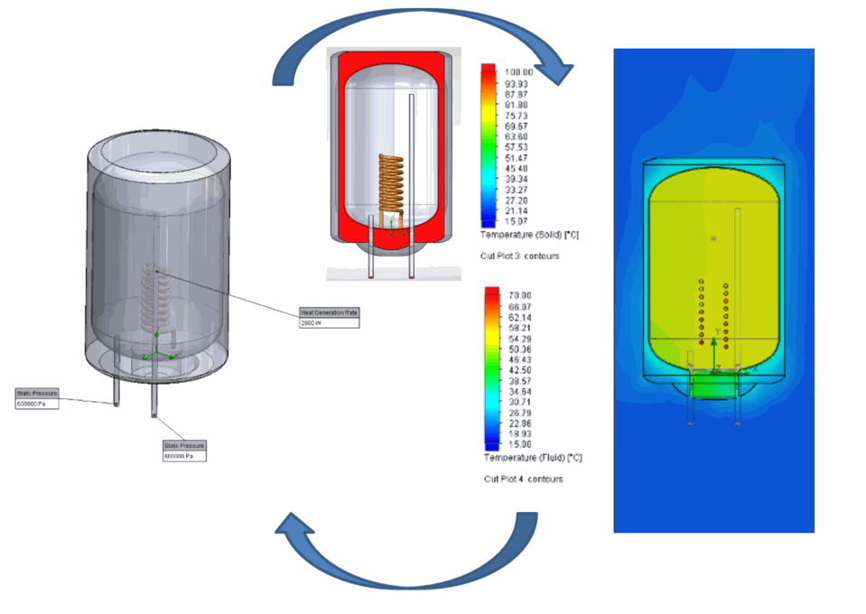Simulacija procesa grejanja i hlađenja vode u bojlerima. Variranje termoizolacionih materijala, debljina limova, pozicija i oblika grejača. Simulacija takozvane termostat analize, gde se postatra vremenski interval između gašenja grejača i paljenja nakon dostizanja gornje i donje granične temperature. Uticaj pritiska, temperature i strukturnih nosećih elemenata na konstrukciju bojlera.