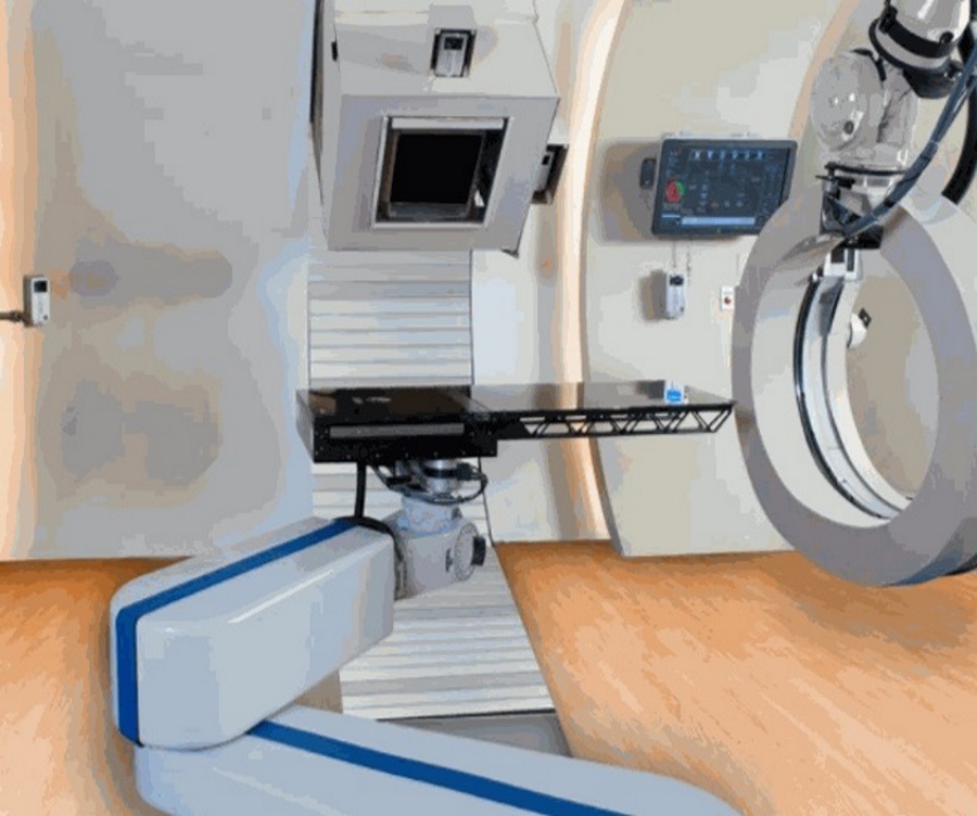 Robotska ruka sa krevetom za pacijenta. Ruka se sinhronizuje sa gornjim protonskim topom koji zapravo vrši tretman pacijenta i uništava kancerogeno tkivo.